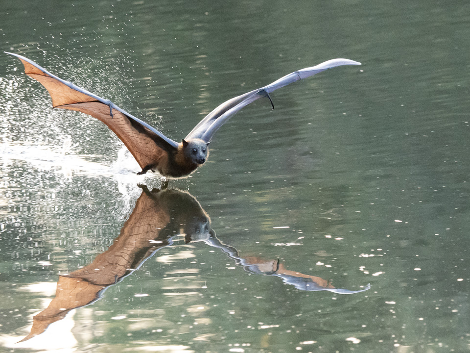 水分補給のため飛びながら腹を濡らすハイガシラオオコウモリ(オーストラリア、右)(写真:大沢夕志)